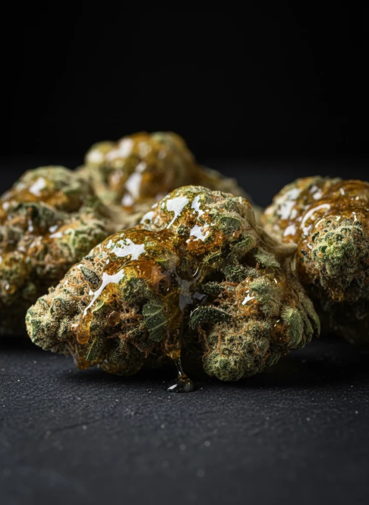 Live resin typically has a sauce-like consistency, ranging from sugary to wet and terpy. Some batches contain small crystalline formations swimming in a sea of terpene-rich sauce. The texture can vary significantly between strains and producers, but the hallmark is always that sticky, aromatic richness.